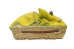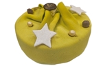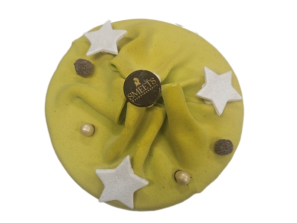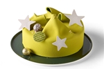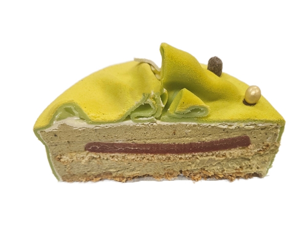 kersttaartje van een crumblebodem met pistachechocolademousse en een verrasing van kersen, in marsepein gewikkeld